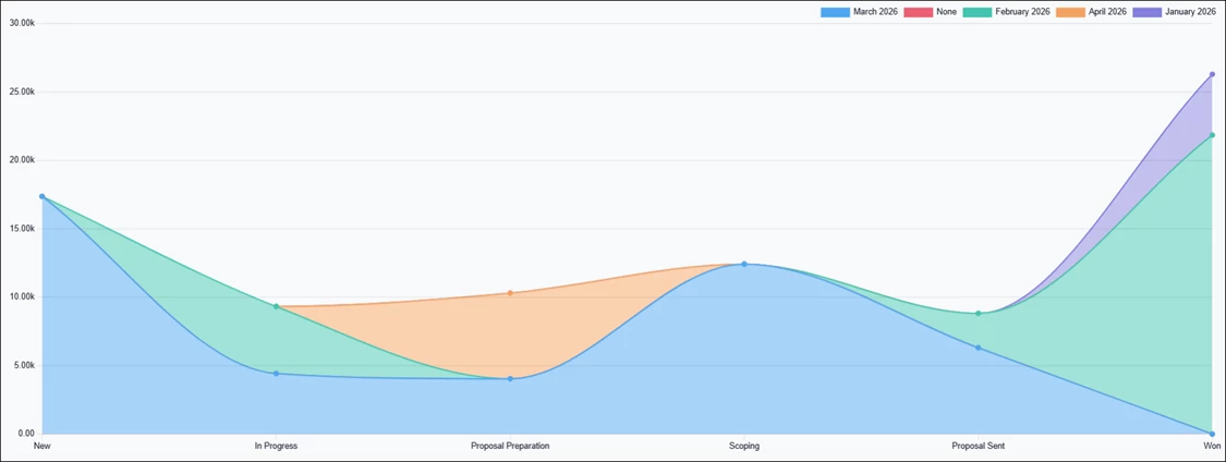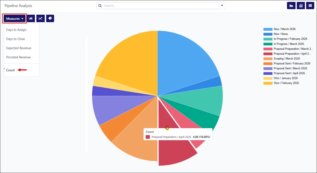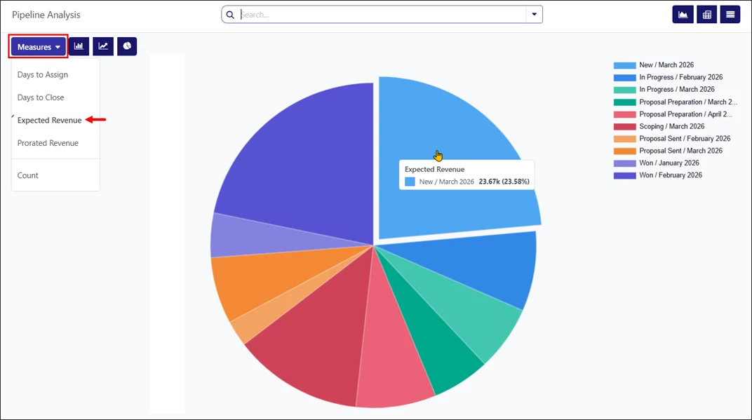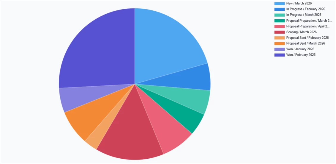 - Pie Chart – Used to display how values are distributed across stages. Clicking each slice opens a detailed list of opportunities for the selected category.