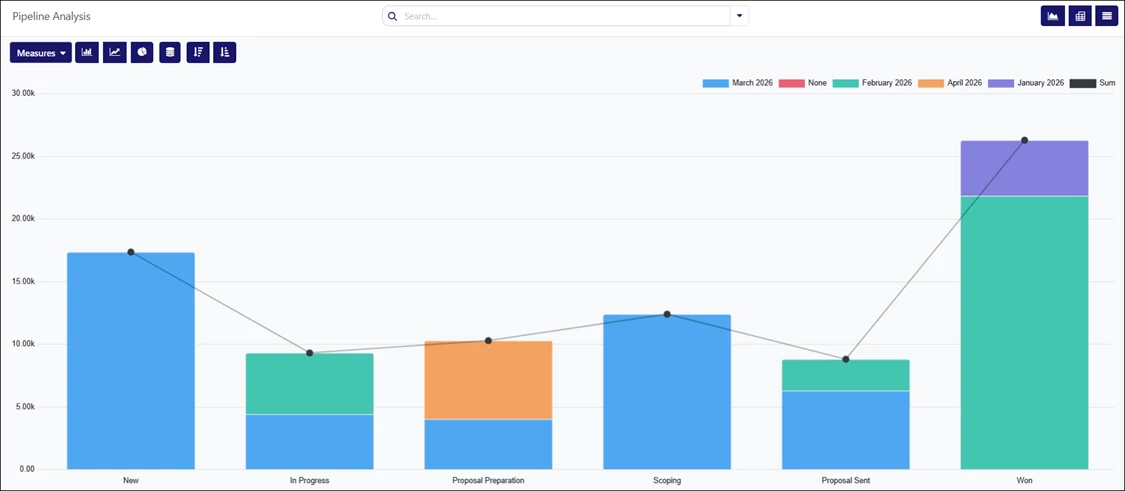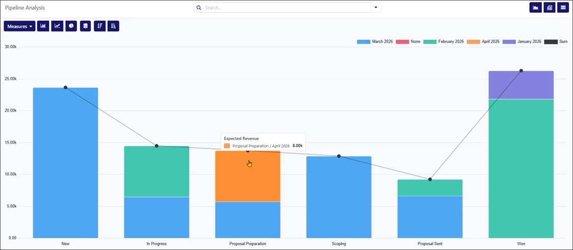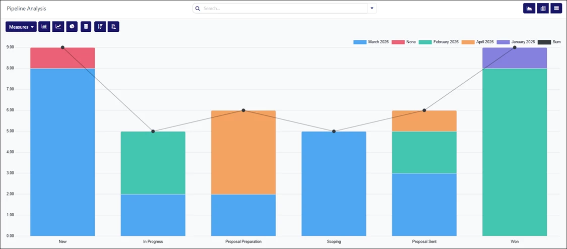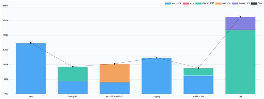 - Bar Chart – Displays the report in a bar chart format, divided by pipeline stages and filtered by expected closing month. Clicking each bar opens a detailed list of opportunities for the selected category. This is the default view.