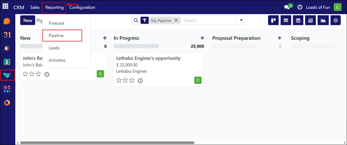 From the top navigation menu, click “Reporting,” then select “Pipeline” from the dropdown menu.