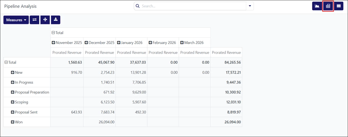 By default, this table view groups the results by sales pipeline stage and measures Prorated Revenue.