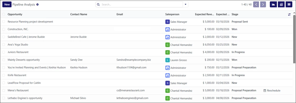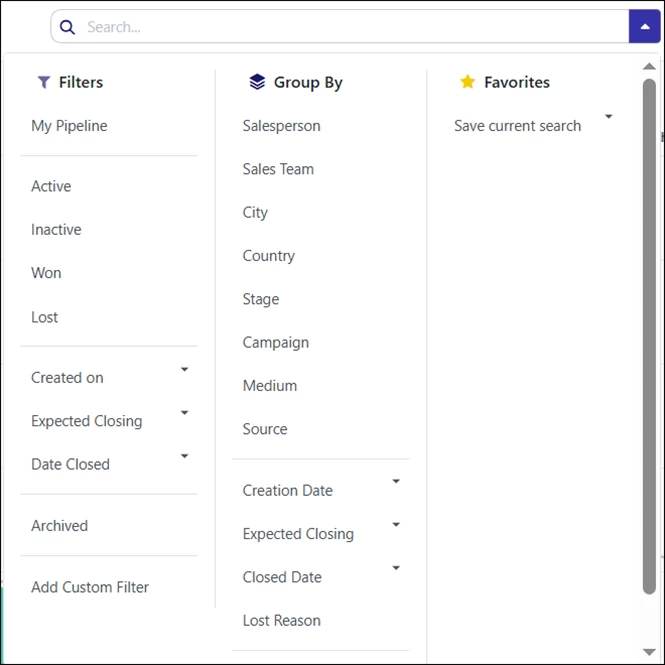 This screen displays all sales opportunities organized by pipeline stage. By default, it shows the current user’s pipeline.